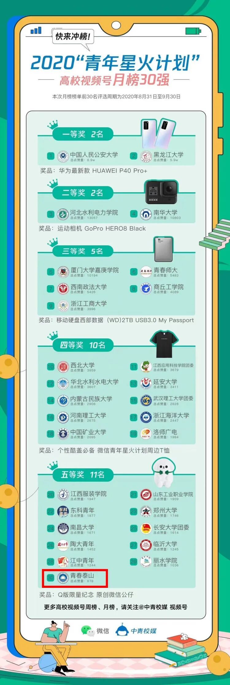 我校的视频号“青春泰山”成功入选“青年星火计划”全国高校月榜30强与周榜100强,将我们的校园故事传讲给更多人听,传播了校园力量,真正做到了增强融媒体传播影响力。