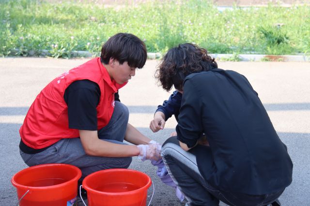 活动过程中,志愿者郭闯提醒大学生们在浸泡捆绑好的衣物时,如何将布料充分浸湿,怎样使得染料颜色不易褪去,模特同学们感受着扎染的魅力,也更加深刻的体会到所需展示的衣服的内涵。在志愿者们的耐心指导下,“新手”们的问题都一一得到了解决。大学生们边听边看边做,手法愈发熟练,色彩、图案的运用也愈发流畅巧妙。