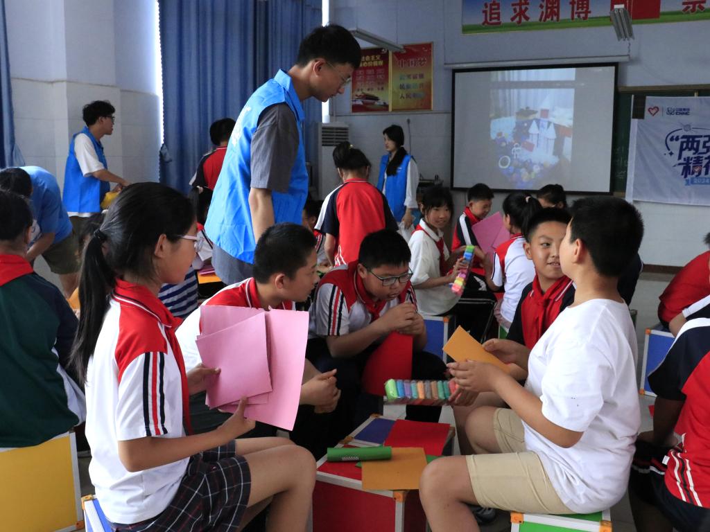 不只是生活里的片片面面,核技术还将为未来的太空任务提供动力。志愿者为小朋友们带来了橡皮泥、卡纸,让他们用简易的工具,制作他们想象中太空里的核技术。橡皮泥揉阿揉,搓阿搓,捏阿捏,颜色各异的橡皮泥撞在一起被搓成球,像宇宙中的星辰般绚丽奇妙。圆筒扣上圆锥,像火箭般穿梭在教室里。志愿者和小朋友们坐在一起,畅想未来,搓在一起的是一代代青年的心灵相聚,高高飞起的,是岁月更迭却精神弥坚的,我们所传承的精神与记忆。