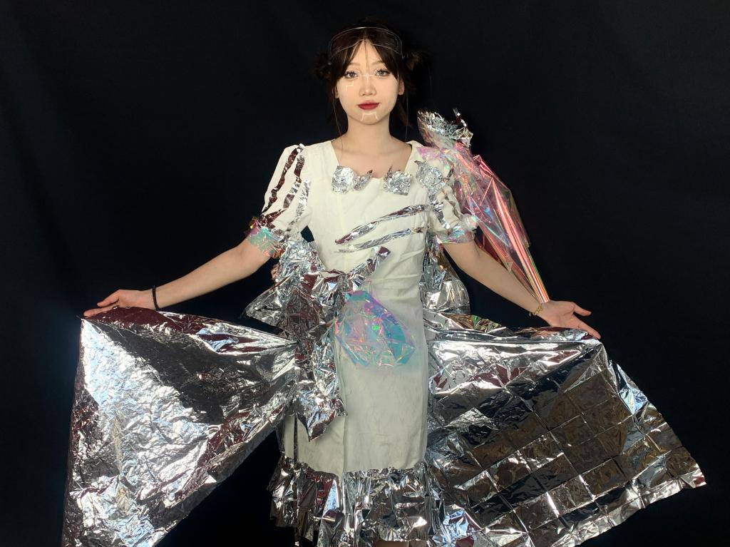 新言书院/行政管理学院何嘉庆同学设计了一款融合了自然元素的AI时装,他巧妙地运用了AI系统对色彩和纹理的精细处理,将大自然的美丽与和谐融入到了时装设计中。反光玻璃纸材质变为流淌的河水,发光灯条化作璀璨的星光,而且能够随着穿着者的动作和情绪发生微妙的变化,让人感受到科技与自然的完美融合。他感慨道:“AI技术让我能够以前所未有的方式表达我的设计灵感,让我看到了科技与艺术相结合的混搭魅力。”