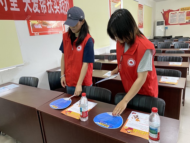 实践团成员抵达村委会党员活动室后,有序地开展场地布置工作。将印有宣传标语的横幅张贴到醒目的位置,把投影设备特意放大画面以便视力较弱的老人看清,并在每个位置上摆放好印有心理健康知识内容的宣传单页与专门定制印有“解忧锦囊妙计”的团扇。