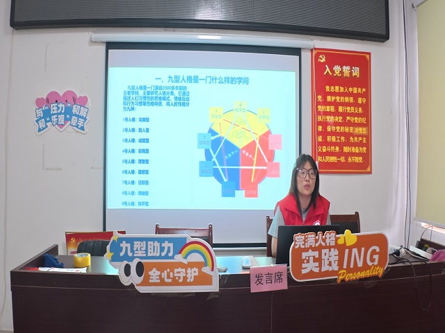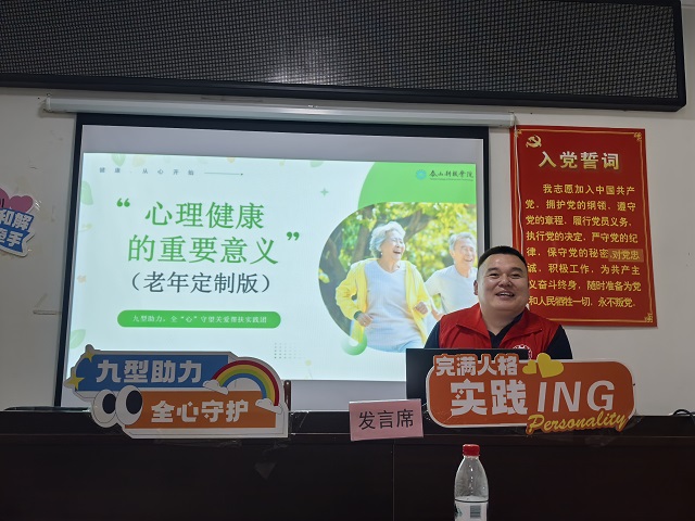 随后,完满人格心理社社长徐佳静以“九型人格家庭关系”为切入点,巧妙的将专业理论转化为生活智慧。“1号完美型老人常因菜炒咸了自责,不妨试试每天允许自己犯一次小错;7号活跃型老人总闲不住,可约老伙计组个棋牌俱乐部。”在自我认知环节,社长徐佳静同学通过生动案例帮助老人识别自身性格类型,引导8号“领袖型”老人分享组织邻里活动的经验,将性格优势转化为社区参与动力。