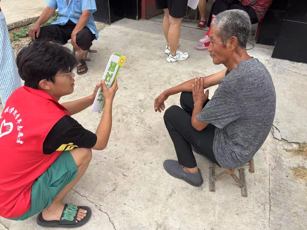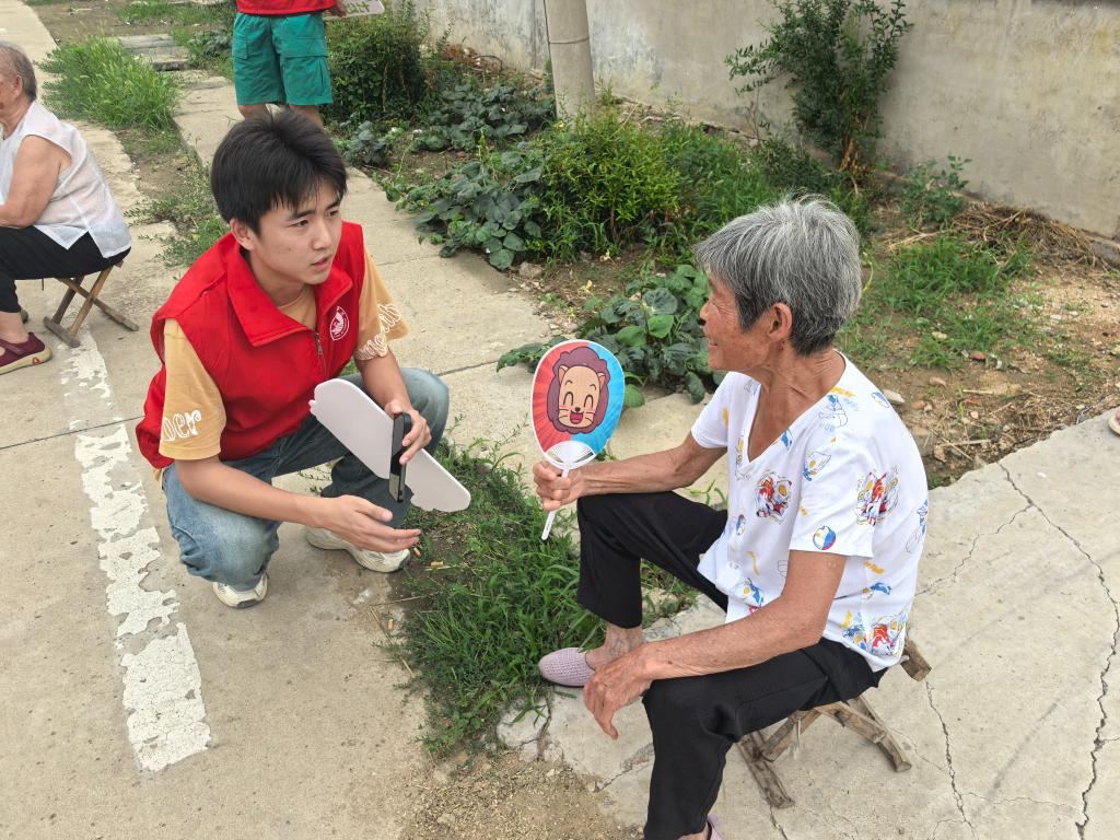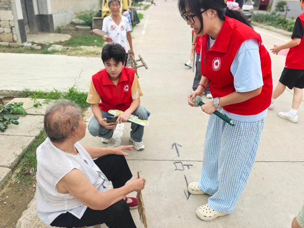 宣传现场,老人们兴趣盎然,纷纷围拢,眼中闪烁着对“新学堂”的好奇与期待。队员赵延玺(汶阳书院/大数据学院)蹲坐在藤椅旁,聆听老党员张伯伯动情回忆:“这老小学啊……当年窗户透风,也没暖气,孩子们冻得直跺脚。”张伯抬手指向校舍,仿佛唤醒了时光深处关于奉献的坚韧身影。这些鲜活的村庄记忆,让队员们深受触动。