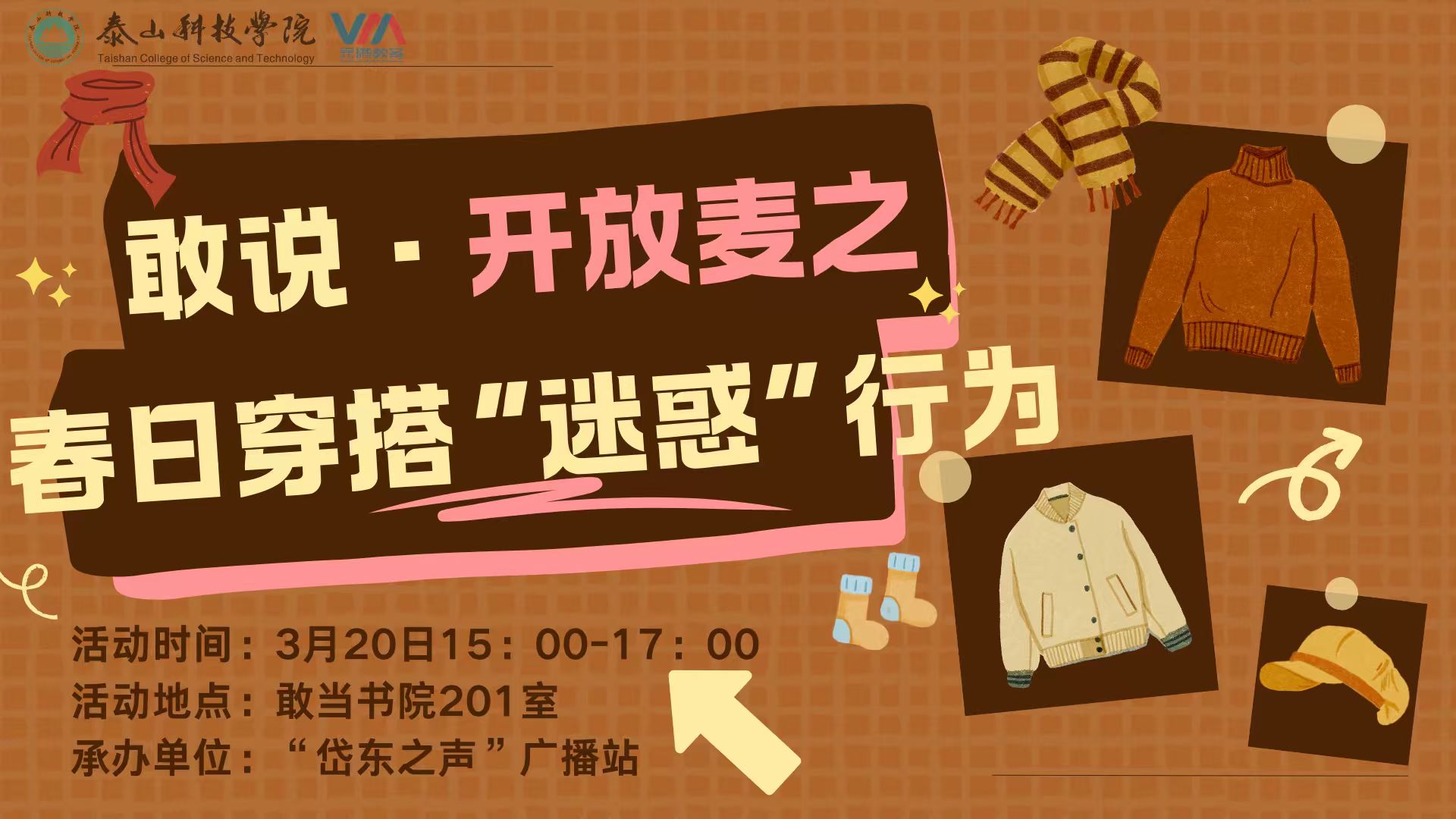 当春日来临,人们的穿衣风格会是千奇百怪还是时髦氧气?3 月 20 日,众人相聚在敢当书院 201,以衣为话、以言为媒,将关于春日穿搭的趣味思考、风格态度与暖心故事,一一娓娓道来。敢说·泰科Talks演讲秀第61期|开放麦之春日穿搭“迷惑”行为是一场穿搭灵感与生活感悟相互碰撞的真诚分享,没有拘束的框架,只有自在的交流;没有刻板的标准,只展现独一份的风采,在这个舞台上,每一种表达都闪闪发光。